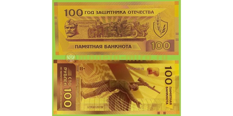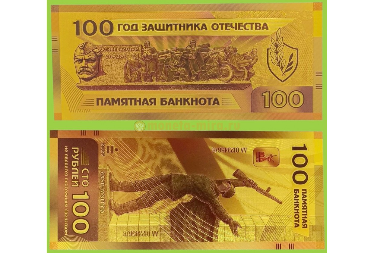 Сувенирная банкнота 100 рублей 2026г. Артиллеристам - Слава!, год защитника Отечества - золотистая