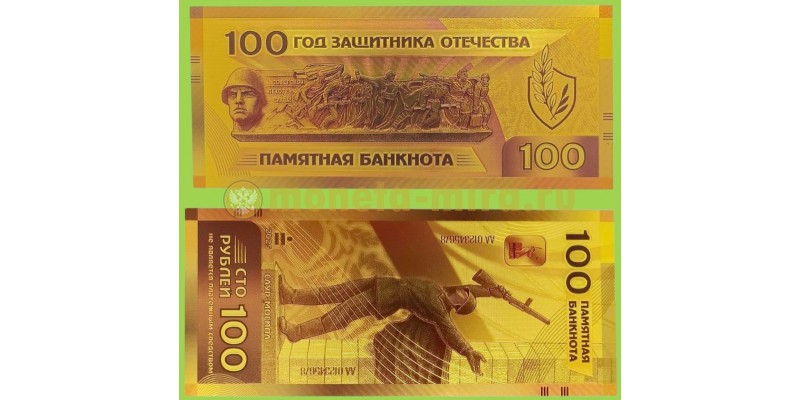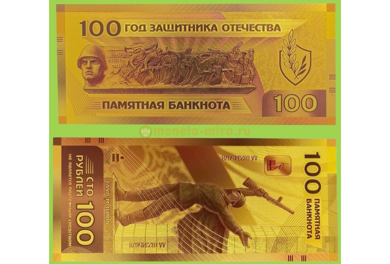 Сувенирная банкнота 100 рублей 2026г. Советской пехоте - Слава!, год защитника Отечества - золотистая
