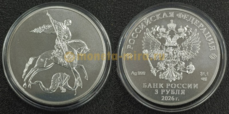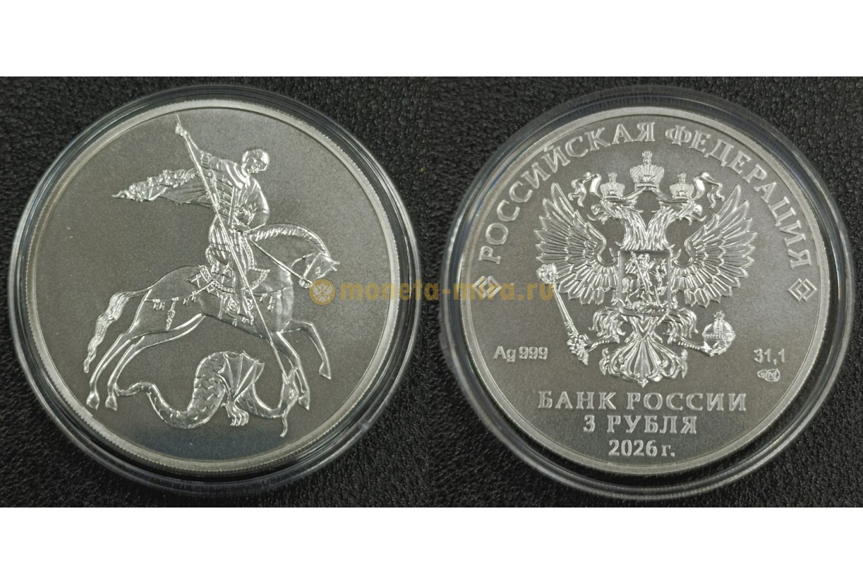 3 рубля 2026 г. Георгий Победоносец, серебро 999 пр. СПМД