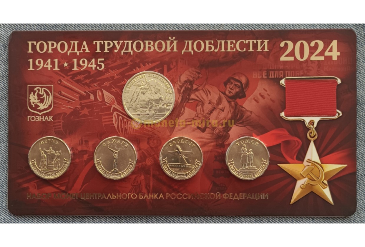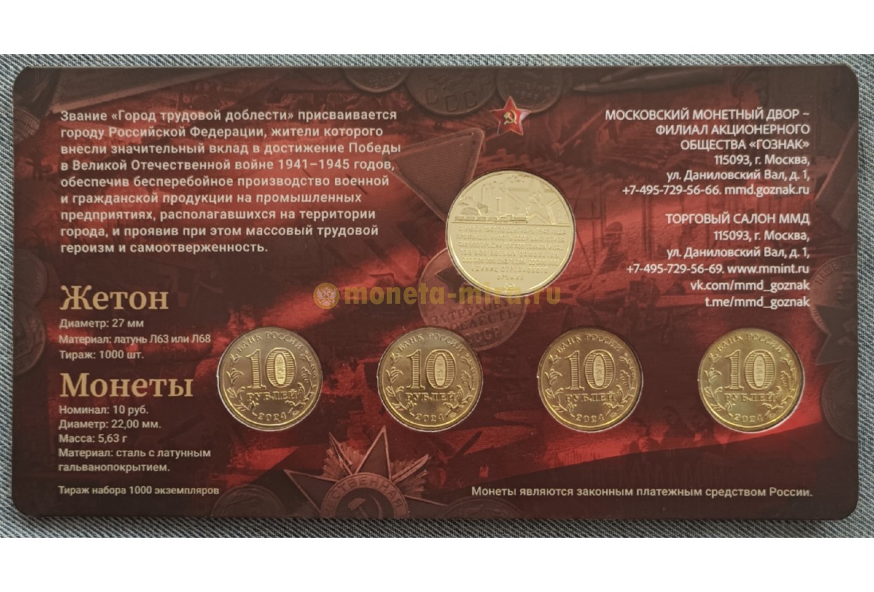 Набор из 4 монет 10 рублей 2024 г. Пермь, Самара, Саратов, Томск, в официальном буклете c жетоном