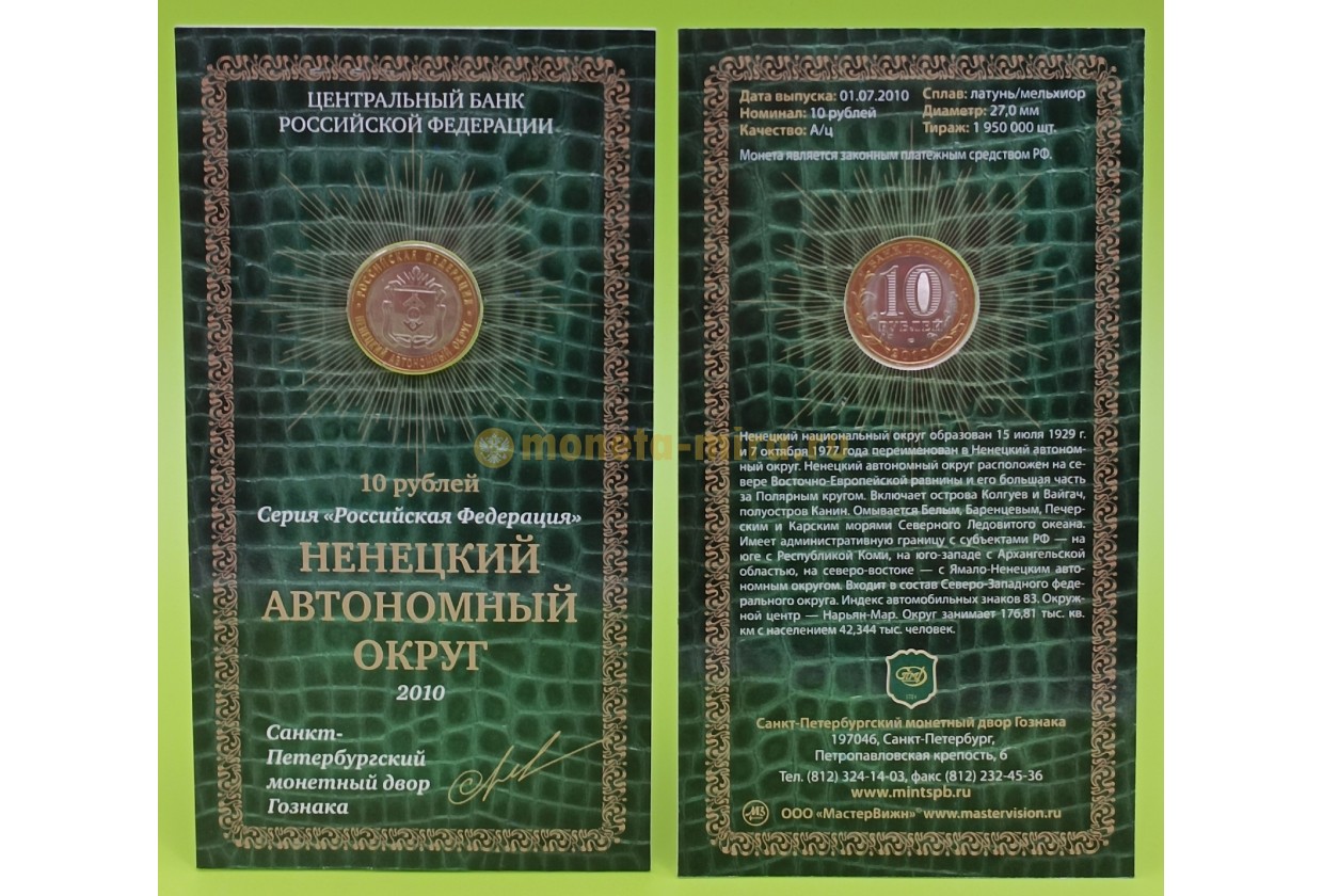 Официальный буклет с монетой 10 рублей биметалл 2010 г. Ненецкий автономный округ, буклет с подписью