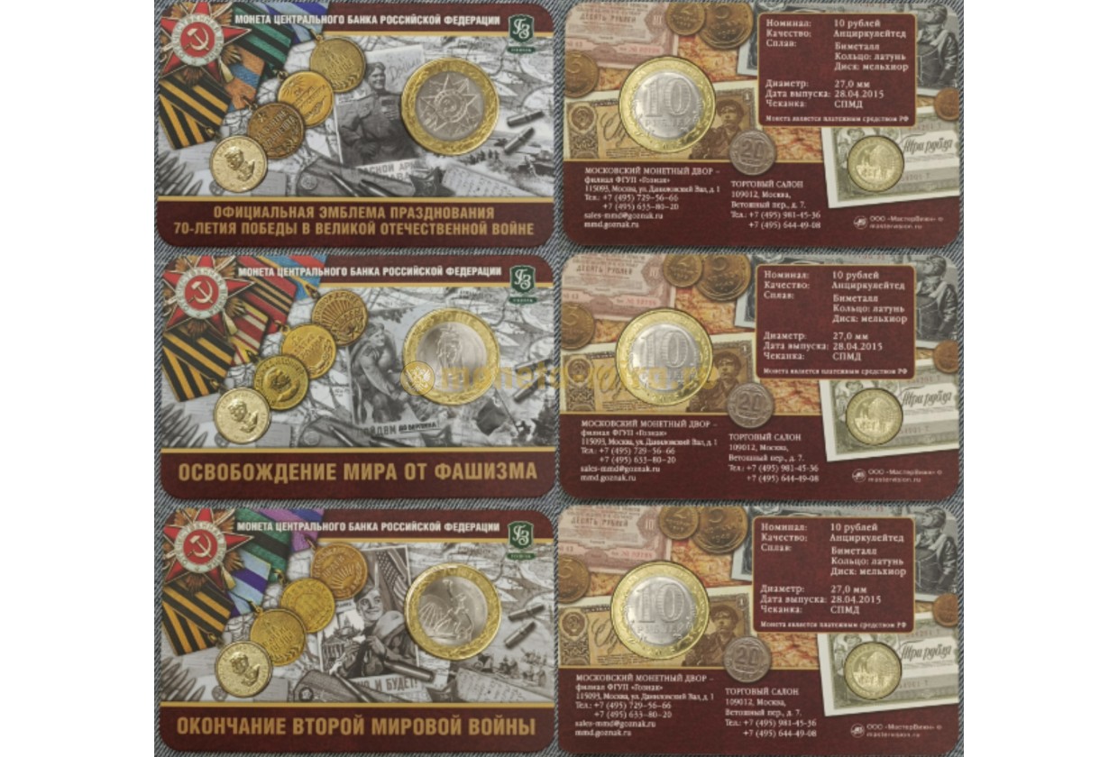 Официальный набор из 3 монет 10 рублей 2015 г. 70 лет Победы, c жетоном ММД, в буклете