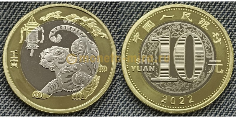 В правой части реверса 10 юаней изображен главный символ 2022 года - стилизованный тигр. Слева от него размещается небольшой китайский фонарь, на которого направлен взор маленького тигра. В верхней части оборотной стороны находится цветочная композиция. В левой части на внешнем кольце реверса расположены два китайских иероглифа.