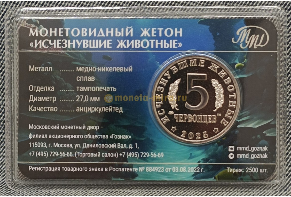 5 червонцев 2025 г. Дунклеостей, серия «Исчезнувшие животные» ММД - выпуск №17